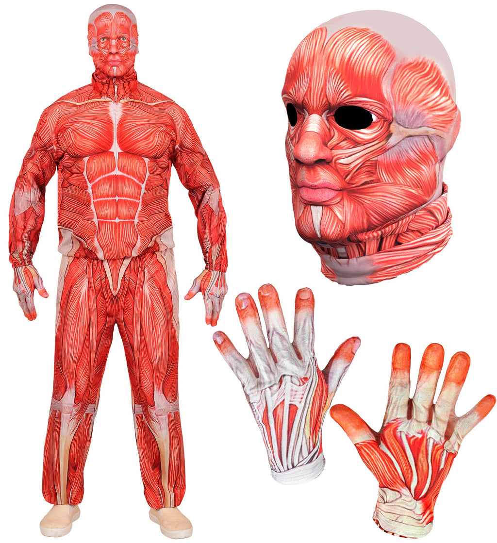 The magic is in the incredibly detailed, photorealistic 3D print that shows off every muscle fiber, from your abs to your glutes. This is a full head-to-toe transformation, including the printed jacket and pants, a pair of matching muscle-print gloves, and a full, gruesome fabric anatomy mask.