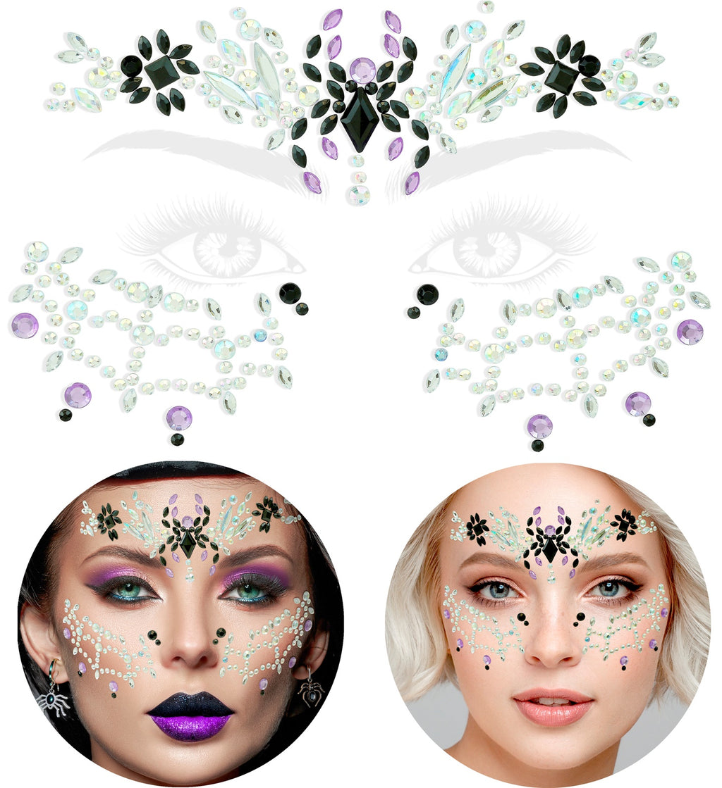 This all-in-one, self-adhesive set features an intricate, symmetrical forehead crown design accented by a central black diamond-style spider motif. Complemented by delicate, web-inspired accent jewels for the cheekbones, these iridescent gems ensure you’re the most brilliant creature in the room.