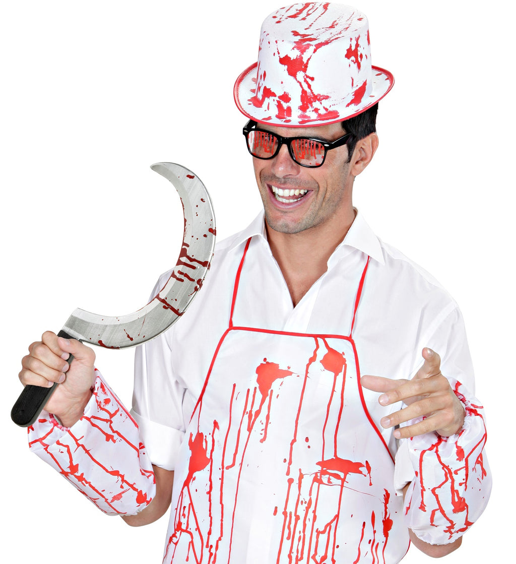 This impressive 45.4cm prop features a large, curved silver blade that looks sharp and menacing. It's generously splattered with realistic fake blood, suggesting you've already had a very busy night.