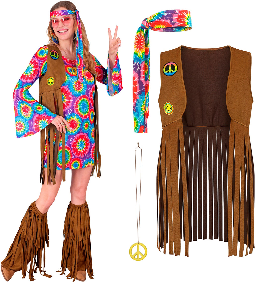 Fringed Boho Vest: Includes a matching brown open-front vest with long, multi-layered fringe, accented with playful peace sign and smiley face patches.