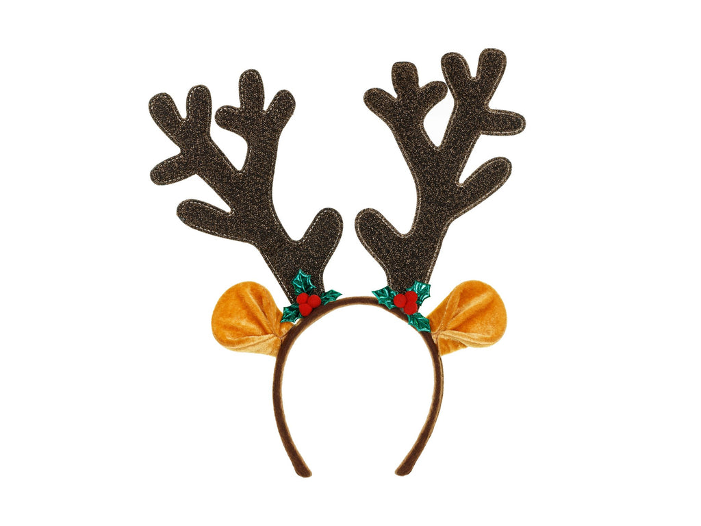 This isn't just any headband. It features a pair of large, sparkly brown antlers that catch the light, plus two super-cute plushy ears. Tucked right in the middle, between the ears, is a festive sprig of holly with red berries, completing that classic reindeer look. It's a fun, statement-making accessory that's sure to get you in the holiday mood!