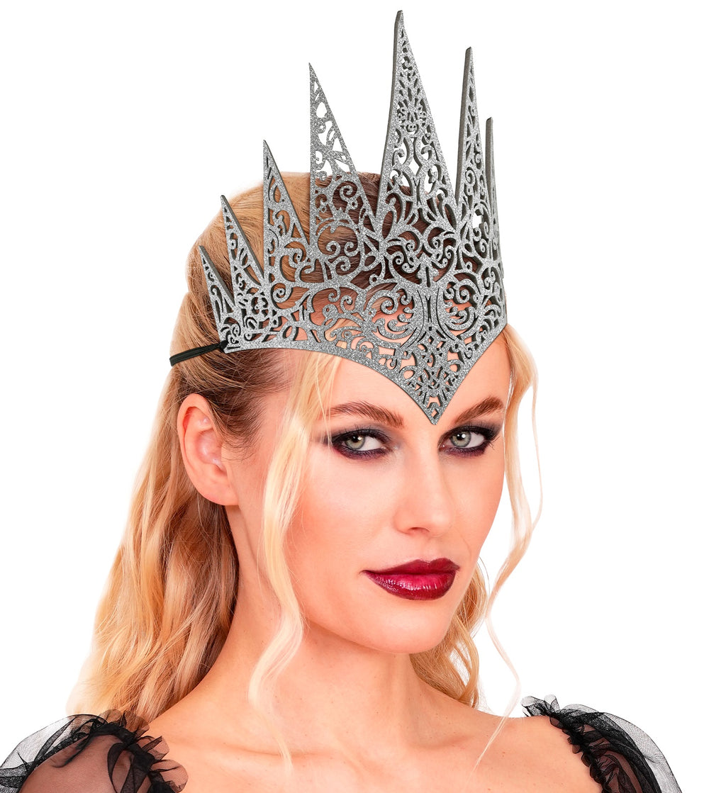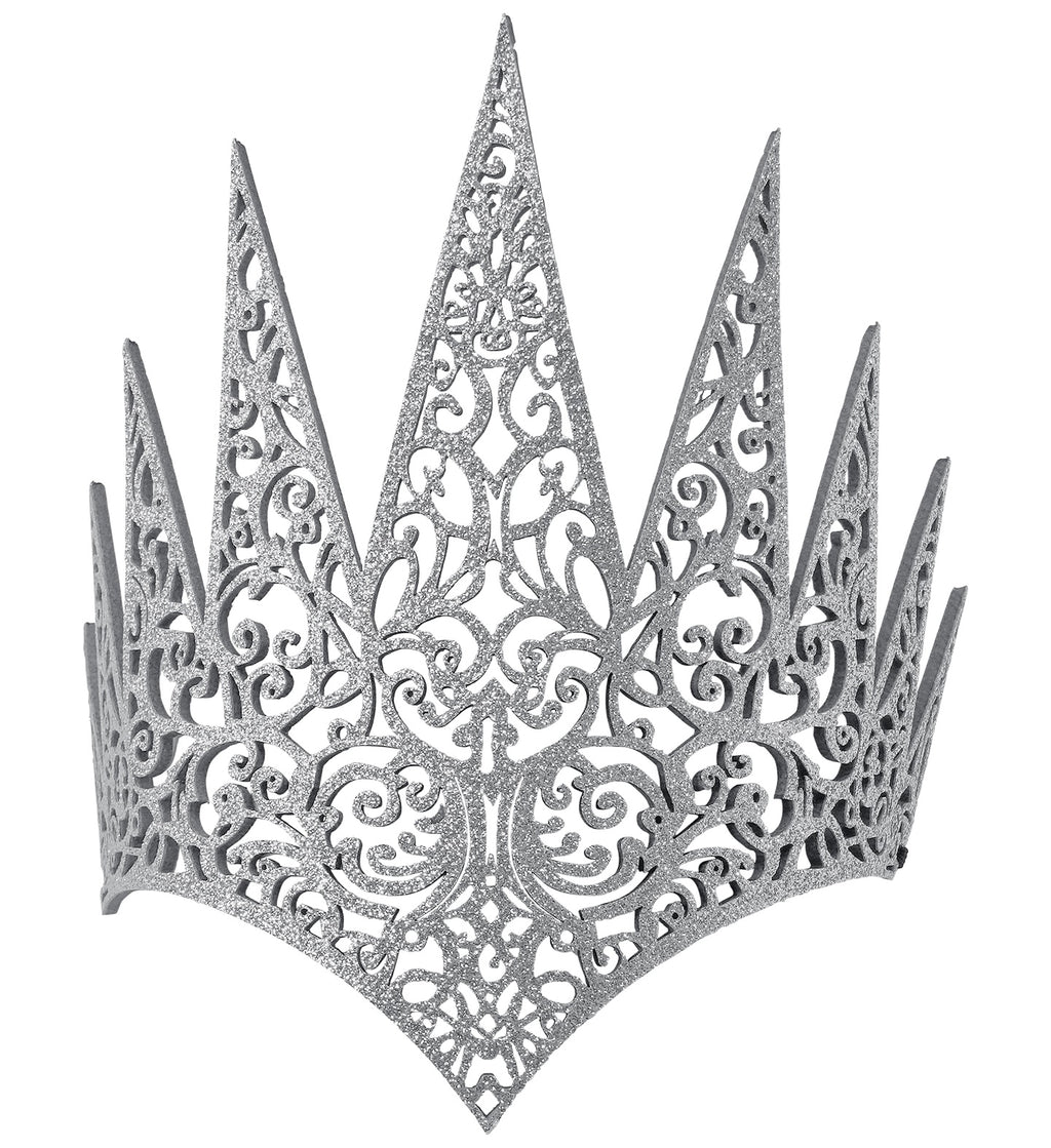 This stunning headpiece is a masterpiece of fantasy design. It features a series of dramatic, sharp peaks that create a powerful and unforgettable silhouette. The entire crown is filled with delicate, swirling filigree, all coated in a dazzling layer of silver glitter that will sparkle under the ballroom lights or the moonlight.