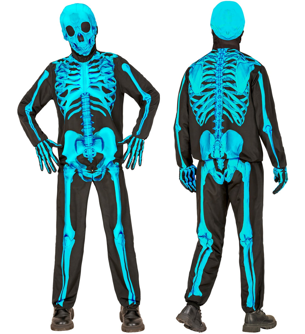 This is a complete head-to-toe transformation, including the jacket and pants with their stunning neon blue skeleton print (on the front and back!), a pair of matching bone-print gloves, and a full fabric skull mask to complete the look.